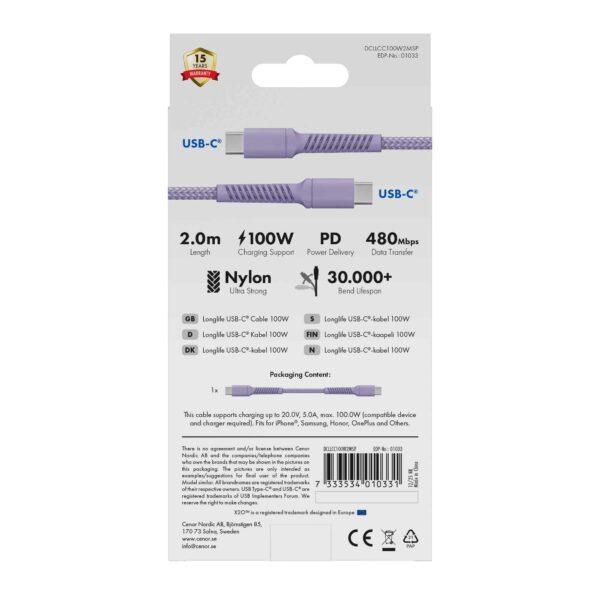 Kablerne er USB 2.0-standard og fås som USB-A -> USB-C (60 W) og USB-C -> USB-C (100 W) i 4 forskellige længder: 0,5 m, 1 m, 2 m og 3 m.
