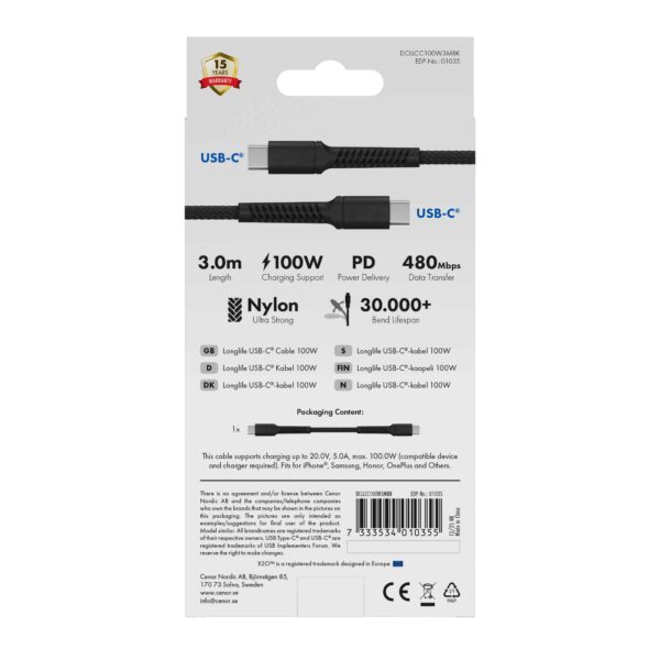Kablerne er USB 2.0-standard og fås som USB-A -> USB-C (60 W) og USB-C -> USB-C (100 W) i 4 forskellige længder: 0,5 m, 1 m, 2 m og 3 m.