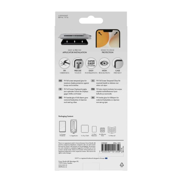 Skærmbeskytteren er fremstillet i 0,33 mm forstærket 9H-glas og dækker hele skærmen, inkl. de afrundede kanter. Den medfølgende monteringsramme sikrer en hurtig og præcis montering uden støv og bobler.