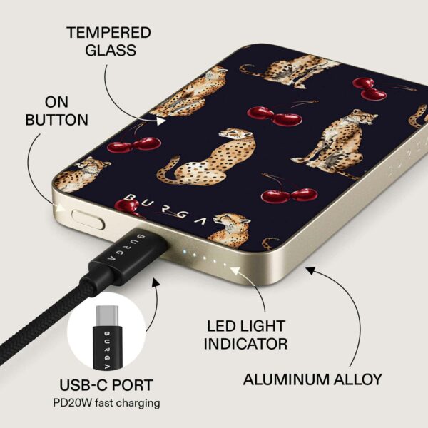 Mød den perfekte blanding af mode og funktion. Denne slanke 5000 mAh power pack holder dine enheder opladet og tilføjer et strejf af stil med BURGAs unikke, fade-proof design. Det er mere end bare en powerbank; det er et statement-møbel, der giver dine enheder strøm når som helst og hvor som helst.