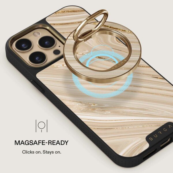 Bemærk! Denne mobilring fungerer kun med MagSafe-kompatible iPhones (12 og nyere) og BURGAs MagSafe-covers. Den fungerer ikke med covers uden MagSafe eller med trådløs opladning.