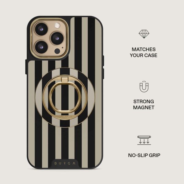 Denne magnetiske mobilring fastgøres med et tilfredsstillende klik – uden lim og uden besvær. Hold den, når du vil rulle med én hånd, brug den som en praktisk holder, når du vil se uden at bruge hænderne, eller som et stilfuldt tilbehør, der passer perfekt til din BURGA-etui.