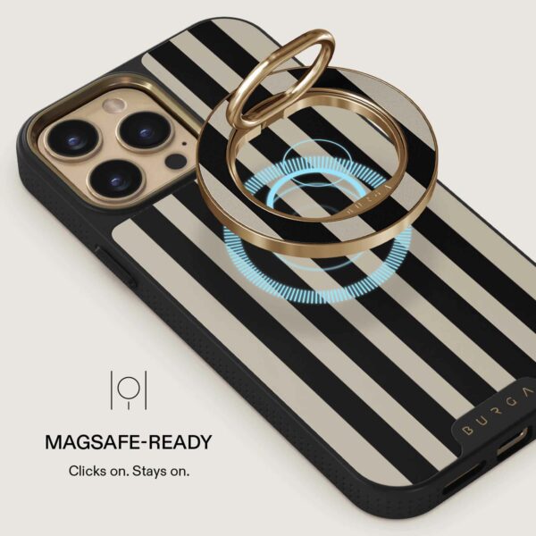 Bemærk! Denne mobilring fungerer kun med MagSafe-kompatible iPhones (12 og nyere) og BURGAs MagSafe-covers. Den fungerer ikke med covers uden MagSafe eller med trådløs opladning.