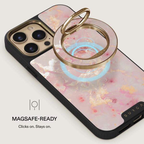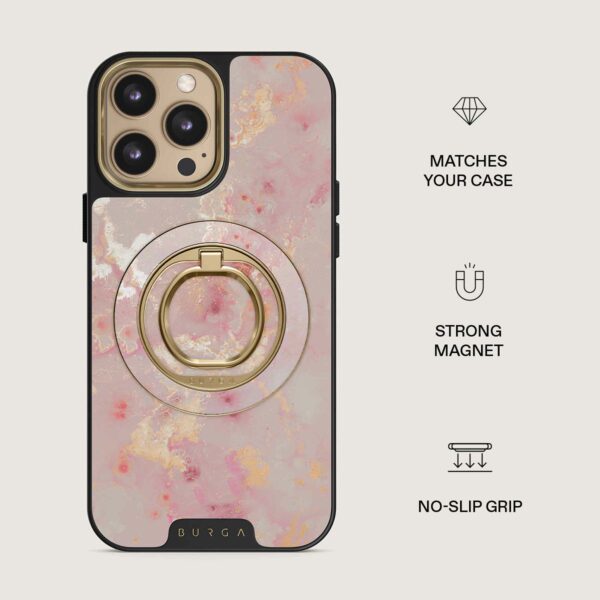 Denne magnetiske mobilring fastgøres med et tilfredsstillende klik – uden lim og uden besvær. Hold den, når du vil rulle med én hånd, brug den som en praktisk holder, når du vil se uden at bruge hænderne, eller som et stilfuldt tilbehør, der passer perfekt til din BURGA-etui.