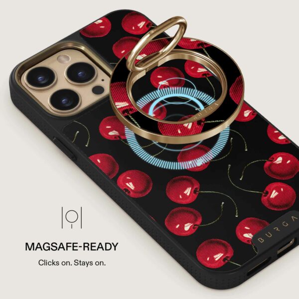 Bemærk! Denne mobilring fungerer kun med MagSafe-kompatible iPhones (12 og nyere) og BURGAs MagSafe-covers. Den fungerer ikke med covers uden MagSafe eller med trådløs opladning.