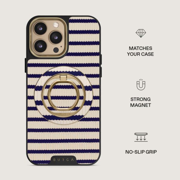 Denne magnetiske mobilring fastgøres med et tilfredsstillende klik – uden lim og uden besvær. Hold den, når du vil rulle med én hånd, brug den som en praktisk holder, når du vil se uden at bruge hænderne, eller som et stilfuldt tilbehør, der passer perfekt til din BURGA-etui.