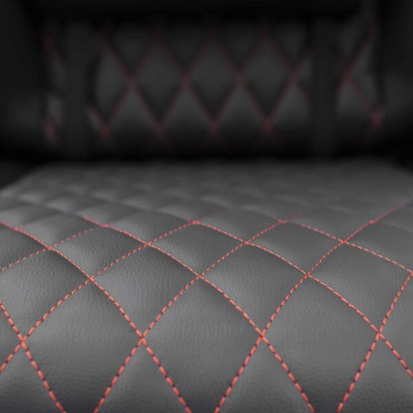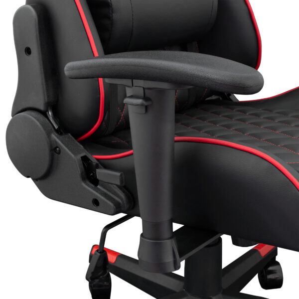 Med 2D-armlæn, 180° ryglæn og hoved-/rygpuder er den designet til ultimativ komfort. Det elegante sorte og røde PU-betræk tilføjer stil, mens den robuste metalramme sikrer holdbarhed.