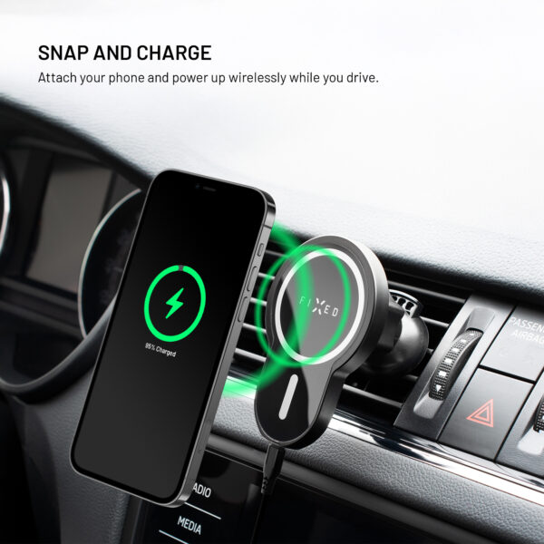 FIXED MagClick-holder, der er udviklet specifikt til den nyeste Apple iPhone med MagSafe, giver dig mulighed for at holde din telefon synligt i bilen, mens du nemt oplader den, mens du kører. Takket være de integrerede magneter skal du bare sætte din telefon i holderen, og den låser sig øjeblikkeligt ved hjælp af MagSafe. Den holder sikkert og modstår nemt alle de stød, som kørsel forårsager. Til hurtig opladning af din iPhone er MagClick holderen udstyret med en højtydende spole med en effekt på 7,5W og op til 15W til andre smartphones, så den kan genopbygge energi på kortest mulig tid.