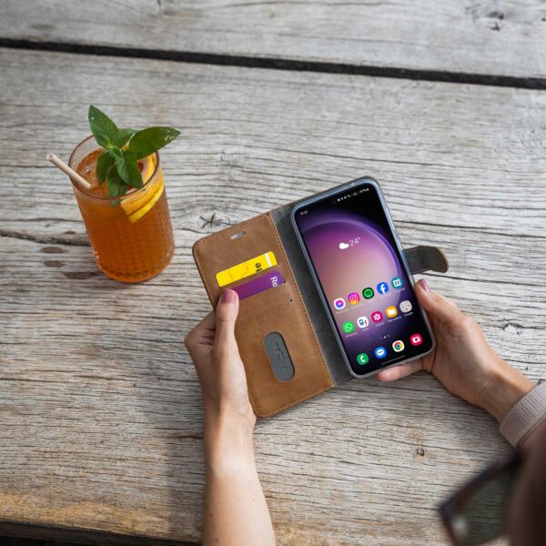 Opus-etuiet er lavet af slidstærkt syntetisk læder, der kan modstå selv hårdhændet behandling og samtidig bevare et stilfuldt udseende. Takket være det slanke design øger etuiet kun telefonens dimensioner en smule og passer derfor komfortabelt i lommen eller håndtasken.
