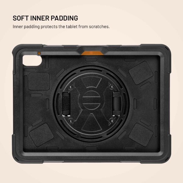 På bagsiden af etuiet er der et drejeligt håndtag, der gør det nemt at holde og håndtere din tablet. Håndtaget kan drejes 360°, så du nemt kan justere det til enhver position og bruge velcrobåndet til at justere håndtagsremmen til enhver håndstørrelse. Håndtaget fungerer også som et praktisk stativ – bare fold det ud, og tabletten placeres stabilt i vandret position, perfekt til at se videoer, videoopkald eller arbejde på farten.