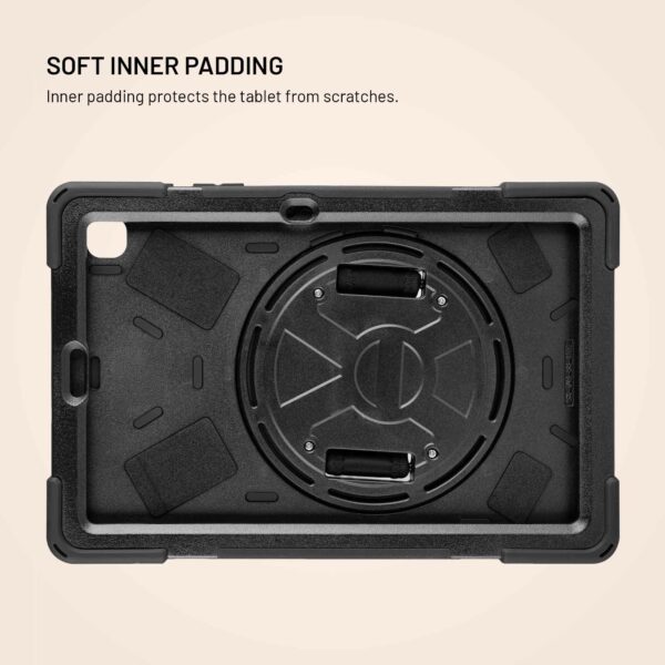 På bagsiden af etuiet er der et drejeligt håndtag, der gør det nemt at holde og håndtere din tablet. Håndtaget kan drejes 360°, så du nemt kan justere det til enhver position og bruge velcrobåndet til at justere håndtagsremmen til enhver håndstørrelse. Håndtaget fungerer også som et praktisk stativ – bare fold det ud, og tabletten placeres stabilt i vandret position, perfekt til at se videoer, videoopkald eller arbejde på farten.
