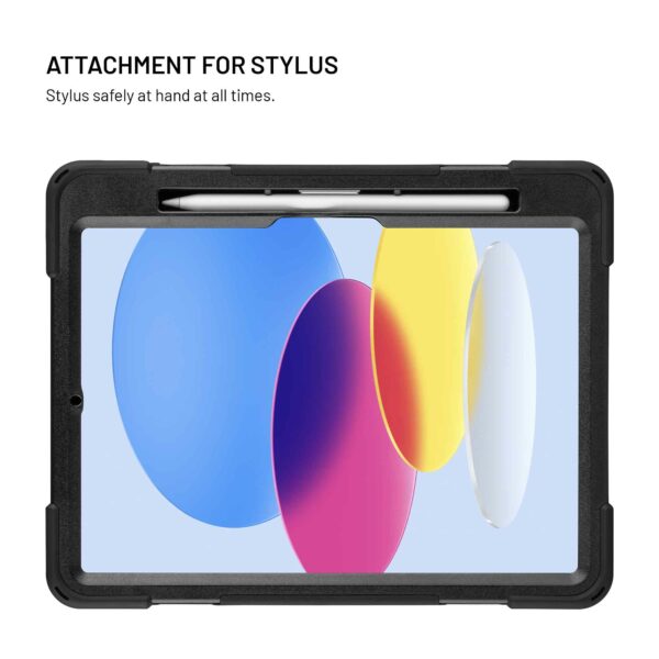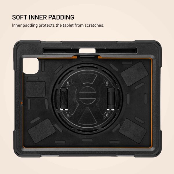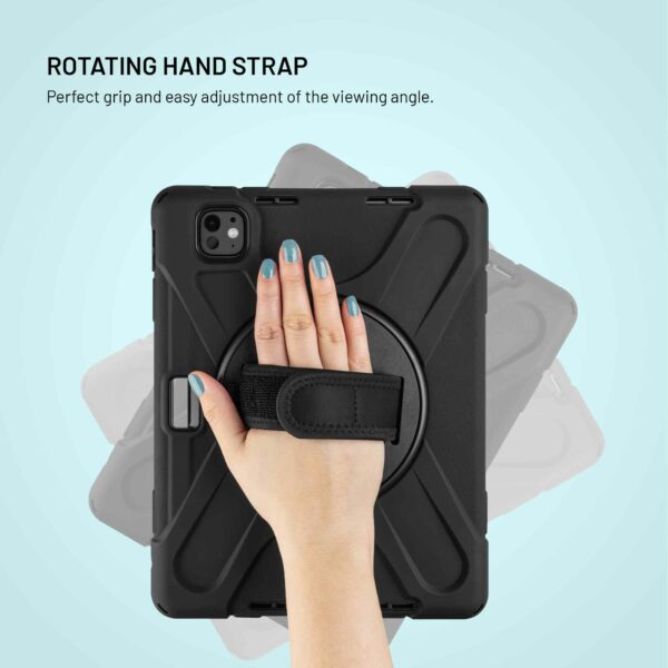 På bagsiden af etuiet er der et drejeligt håndtag, der gør det nemt at holde og håndtere din tablet. Håndtaget kan drejes 360°, så du nemt kan justere det til enhver position og bruge velcrobåndet til at justere håndtagsremmen til enhver håndstørrelse. Håndtaget fungerer også som et praktisk stativ – bare fold det ud, og tabletten placeres stabilt i vandret position, perfekt til at se videoer, videoopkald eller arbejde på farten.