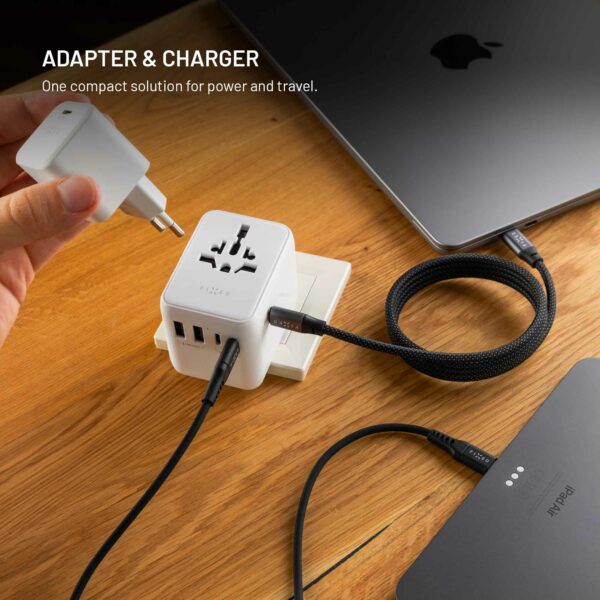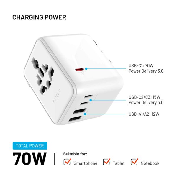 Men FIXED stopper ikke der. I modsætning til almindelige rejseadaptere fungerer den som en kraftfuld opladestation. Med tre USB-C-porte og to USB-A-porte leverer den op til 70 W samlet effekt. Det betyder, at du nemt kan oplade din bærbare computer, mobiltelefon, tablet og andre krævende enheder – alt sammen på samme tid.