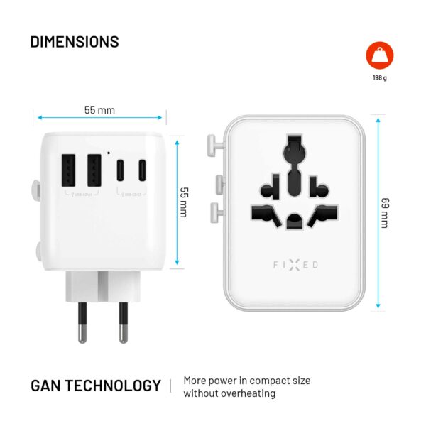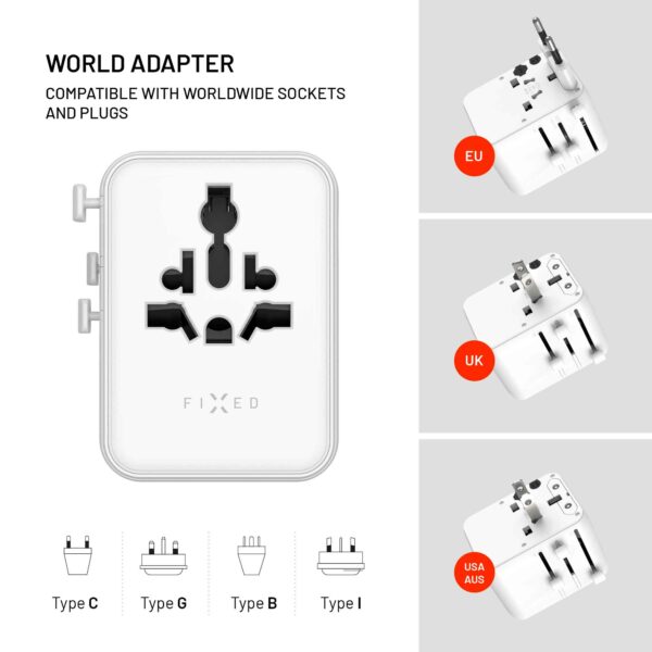 FIXED rejseadapteren følger med dig, uanset hvor du rejser hen – og tilpasser sig øjeblikkeligt. Takket være de udtrækkelige opladningsstik kan du nemt sætte den i stikkontakter i EU, USA, Storbritannien, Australien, New Zealand og andre Commonwealth-lande.