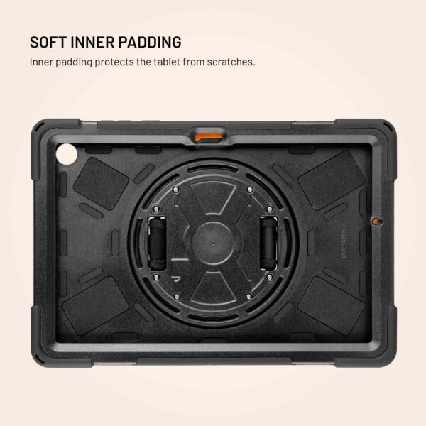 På bagsiden af etuiet er der et drejeligt håndtag, der gør det nemt at holde og håndtere din tablet. Håndtaget kan drejes 360°, så du nemt kan justere det til enhver position og bruge velcrobåndet til at justere håndtagsremmen til enhver håndstørrelse. Håndtaget fungerer også som et praktisk stativ – bare fold det ud, og tabletten placeres stabilt i vandret position, perfekt til at se videoer, videoopkald eller arbejde på farten.