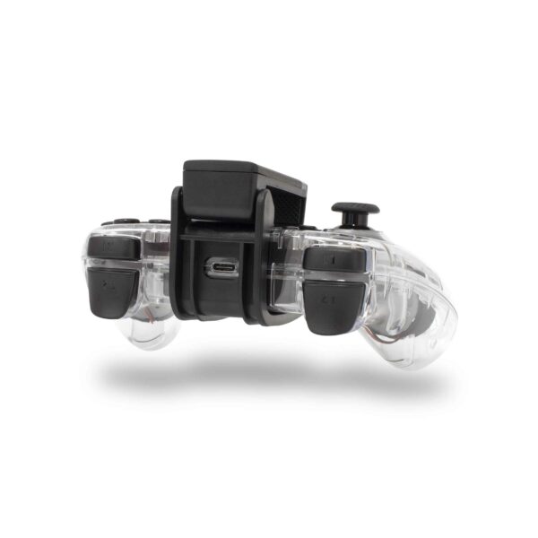 Det 800 mAh Li-polymer-batteri garanterer 5-10 timers episk gaming. Denne transparente gamepad vejer 220 g. LEGION tilpasser sig alt fra Android til iOS (MFI), N-Switch til Windows (kablet) og PS4/PS3.