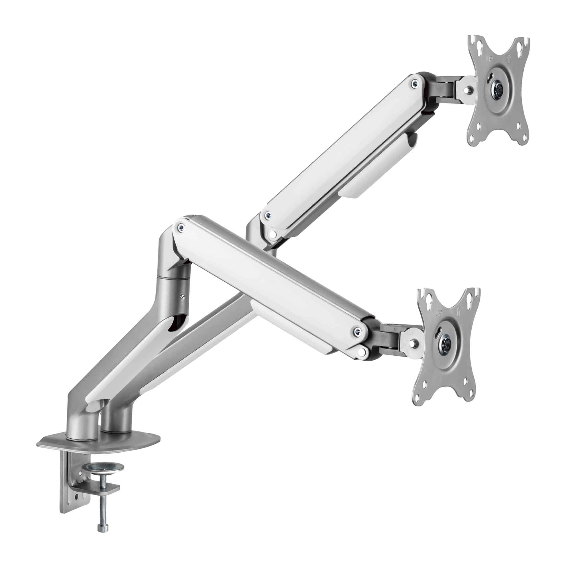 Du kan nemt dreje, vippe og rotere skærmen. Den sølvfarvede stål- og aluminiumskonstruktion giver elegant holdbarhed. Den er også velegnet til buede skærme og kan bære op til 9 kg pr. skærm. Med aftagelig VESA-plade, kabelstyring og justerbar klemme- eller grommetinstallation.