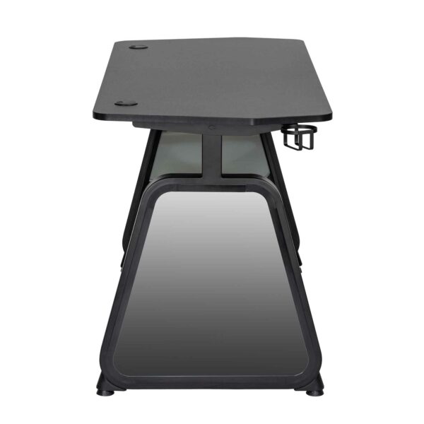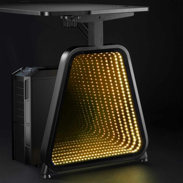 Gør dig klar til episke kampe. Bordet er fremstillet af spånplade, stål og hærdet glas og er lige så robust som det er elegant i sort. Den indbyggede »infinity« RGB LED-belysning drives af USB 5V/2A og skaber stemning. Det har også plads til dit headset og holder dine drikkevarer inden for rækkevidde. Med en bæreevne på 75 kg og dimensioner på 1360x600x750 mm kan du erobre gamingverdenen med stil.