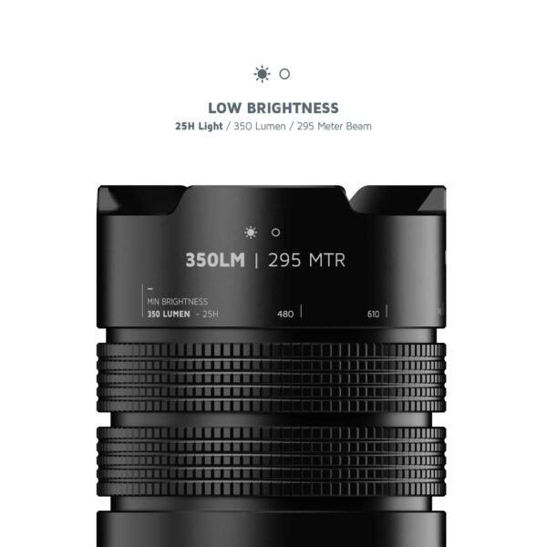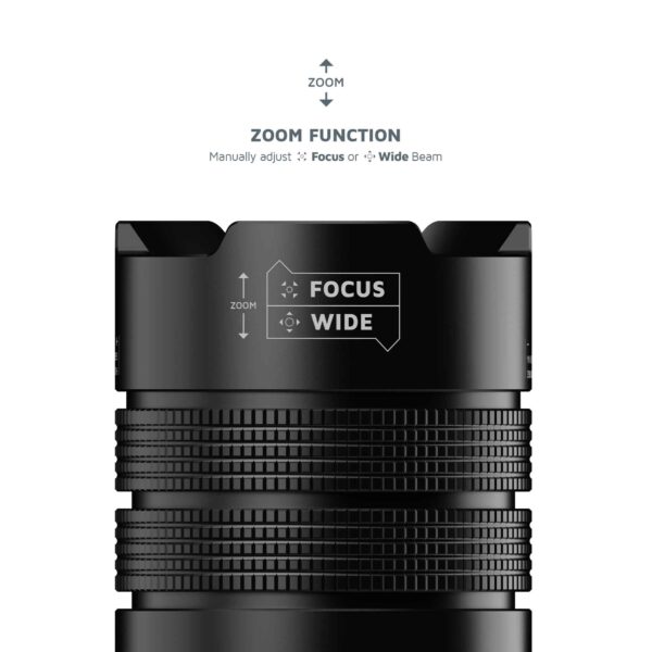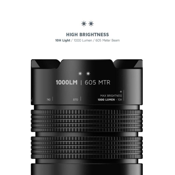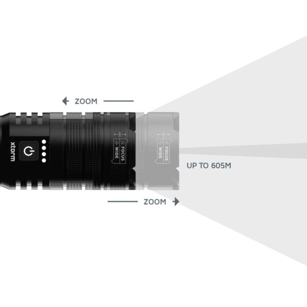 Den kraftige lommelygte har en lysstyrke på mindst 300 og højst 1000 lumen med LED-type 15W SMD. Ved en lav lysstyrke på 300 lumen lyser lommelygten i op til 25 timer og oplyser op til 295 meter. Ved maksimal lysstyrke på 1000 lumen lyser den i 10 timer med en rækkevidde på 605 meter! Inden for disse to indstillinger kan du justere lysstrålens bredde ved at zoome ind og ud. Du kan skifte mellem en bred og fokuseret lysstråle ved at trække i den øverste del.