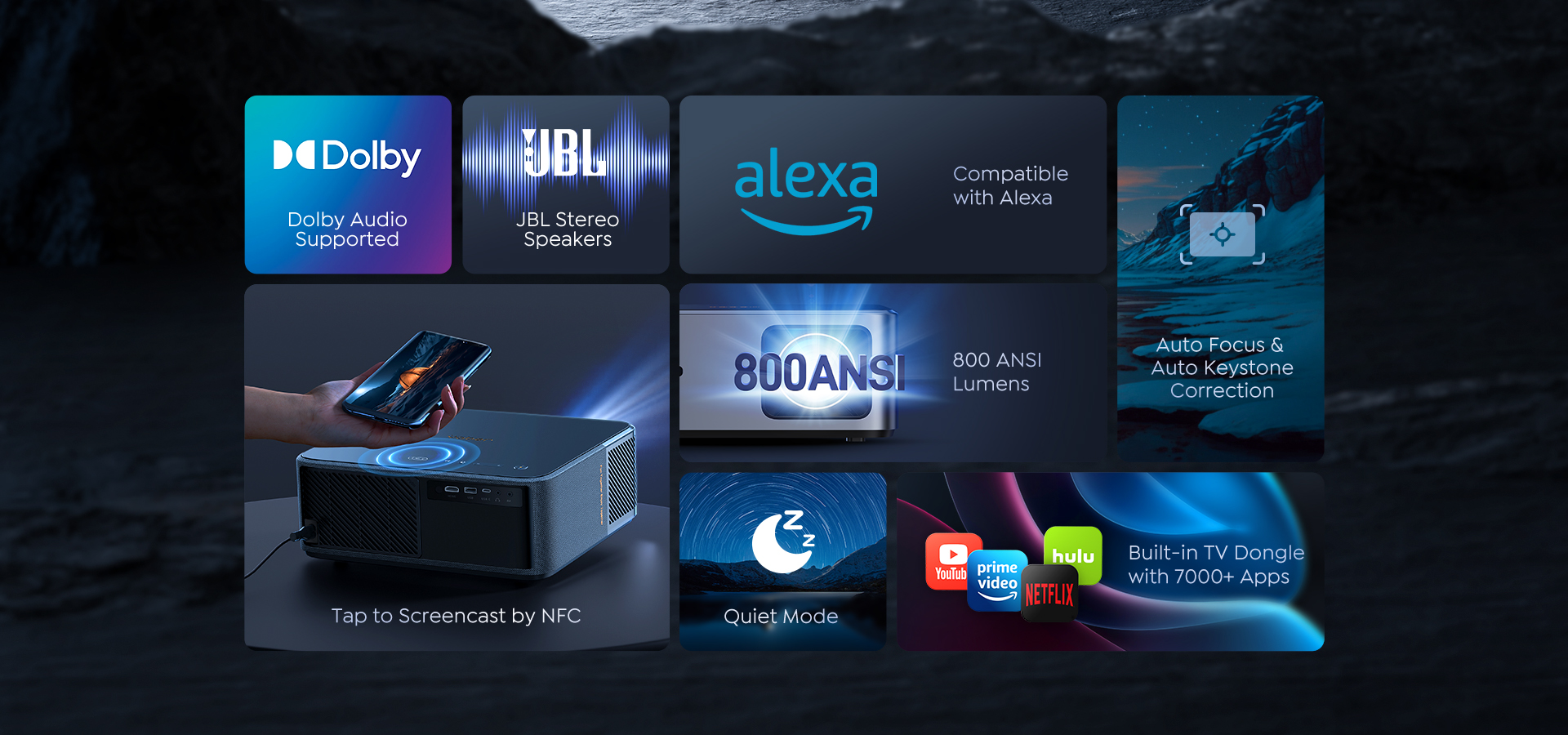 K2's smarte projektor tilbyder problemfri tilslutning og bekvemmelighed, så brugerne øjeblikkeligt kan dele deres indhold fra deres NFC-aktiverede enhed med blot et enkelt tryk, hvilket gør den til den ultimative løsning til problemfri og hurtige præsentationer eller spontane filmaftener.