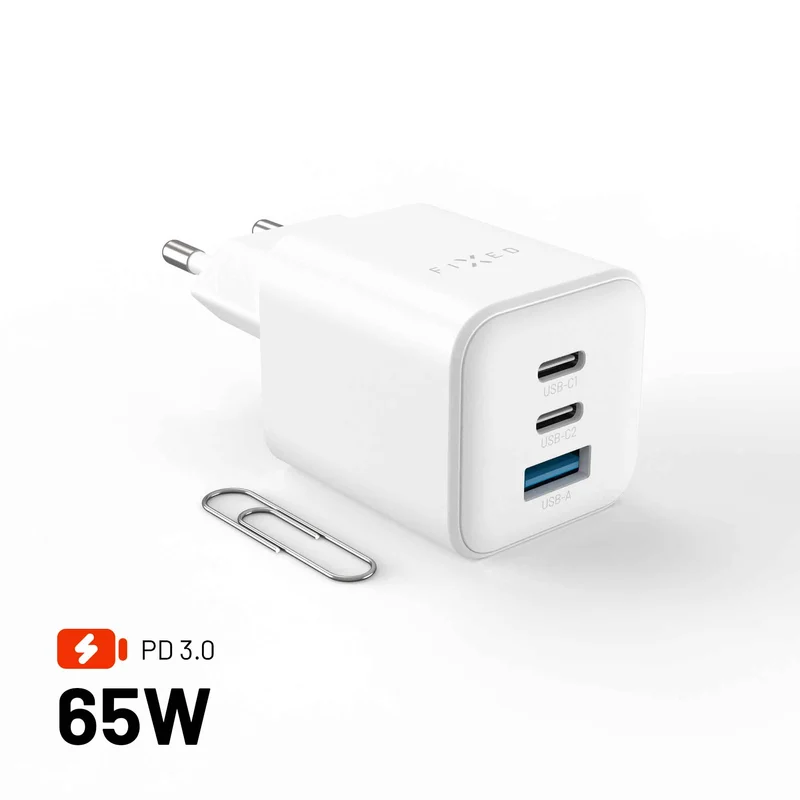 FIXED Superhurtig mini-oplader 65 W 2xUSB-C PD + USB-A hvid